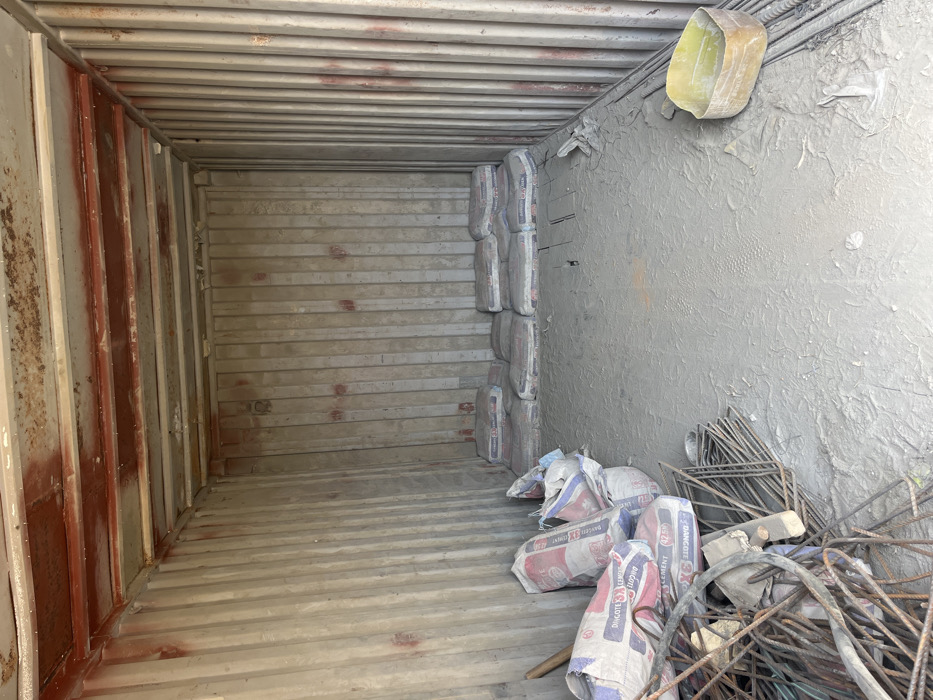 The interior of a corrugated metal shipping container in Gyellesu, Nigeria, functions as a storage area for construction materials