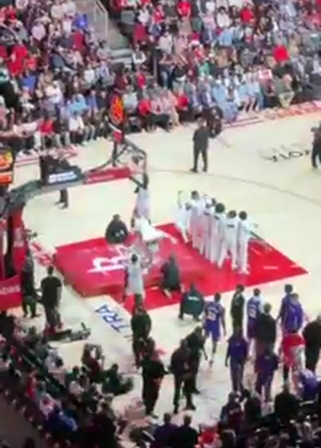 basketball game in progress at a stadium. A team in white uniforms is huddled together on the court at center court, while players in purple uniforms are nearby. Many people can be seen in the stands. The court has a large red logo painted on it, and the name "Toyota Center" is visible in white lettering. A large screen displays the word "Rockets" along with some images. Several people are standing around the court, including some with cameras. The scene is brightly lit. The music seems celebratory and energizing.