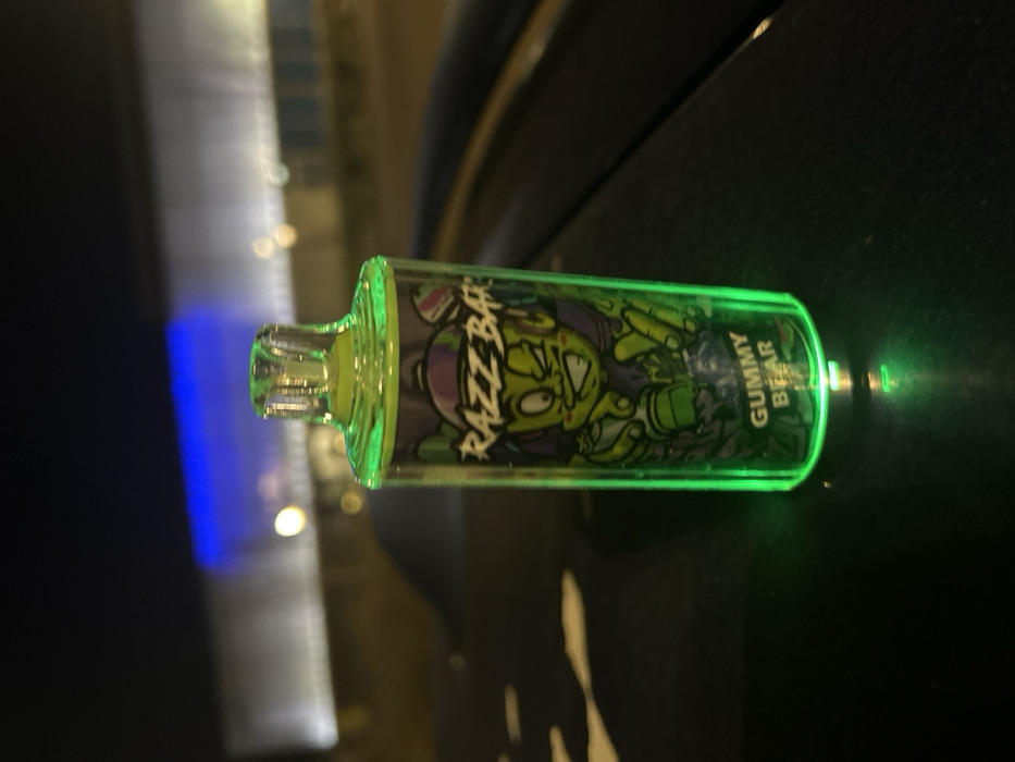 - "A cylindrical, illuminated disposable vape device, branded "RAZZ BAR" with "GUMMY BEAR" flavor text and a green cartoon character graphic, stands upright on a dark, reflective surface, possibly a vehicle's exterior" by FM-RKs823, licensed under CC BY 4.0