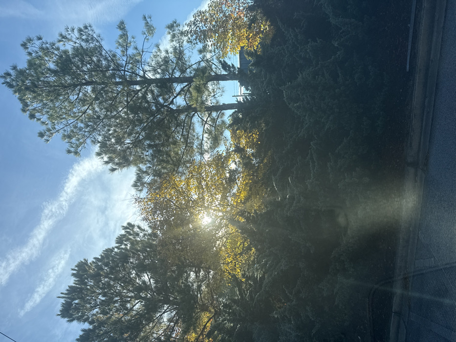 The image presents an outdoor daytime scene under a bright blue sky with sparse, wispy clouds. The sun is prominently visible in the upper-left quadrant, emitting strong rays that create significant lens flare across the frame. The scene is dominated by dense vegetation, including several tall evergreen trees with dark green needles, particularly on the left and right sides. In the middle, a cluster of deciduous trees exhibits vibrant yellow foliage, intensely illuminated by the sun. Below these trees, a thick, dark green mass of coniferous shrubs and smaller trees forms a densely packed embankment, extending from the midground towards the lower frame. The foreground features a dark asphalt roadway, bordered by a concrete curb along the bottom edge of the vegetation. In the upper-right background, a utility pole with horizontal cross-arms and a dark, rectangular structure are partially visible through the foliage. No individuals, actions, or interactions are depicted. No specific identifiable landmarks are present in the image to determine a precise location within Loganville, United States.