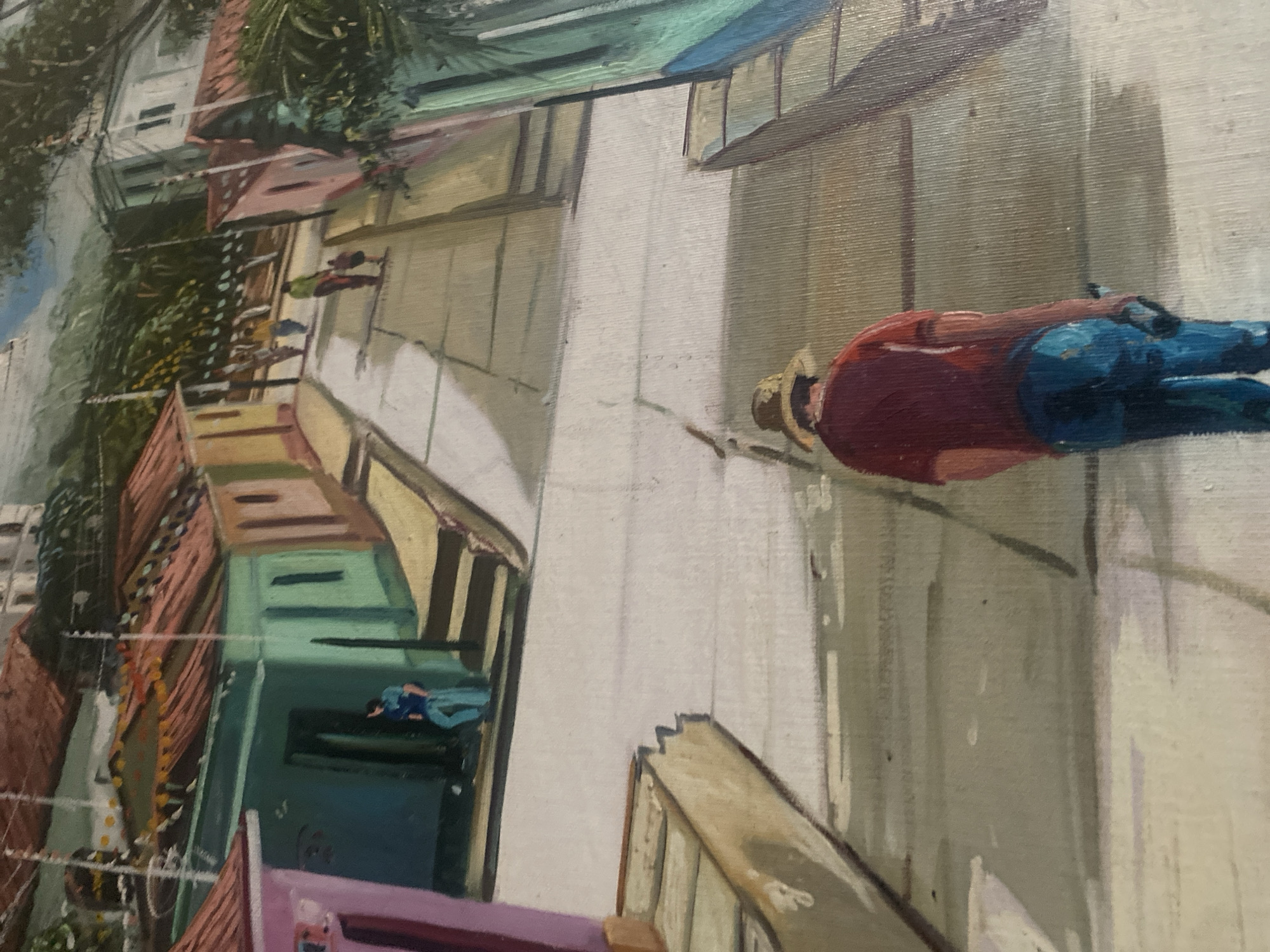 An impressionistic painting presents a street scene with vibrant, albeit somewhat distorted, architecture