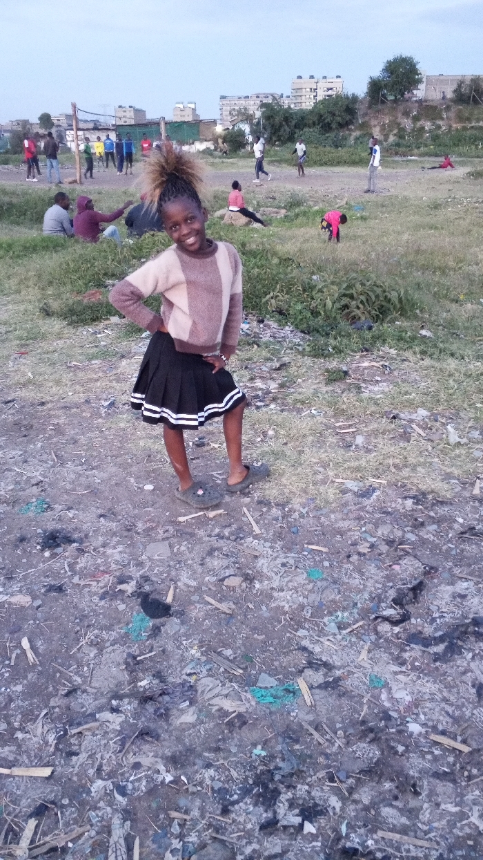 A young girl smiles, hand on her hip, standing in a dirty field. She wears a brown and beige sweater, a black skirt with white stripes, and gray shoes. Behind her, several people are playing volleyball and other games. Buildings are visible in the background. The ground is covered with trash. The sky is light blue.