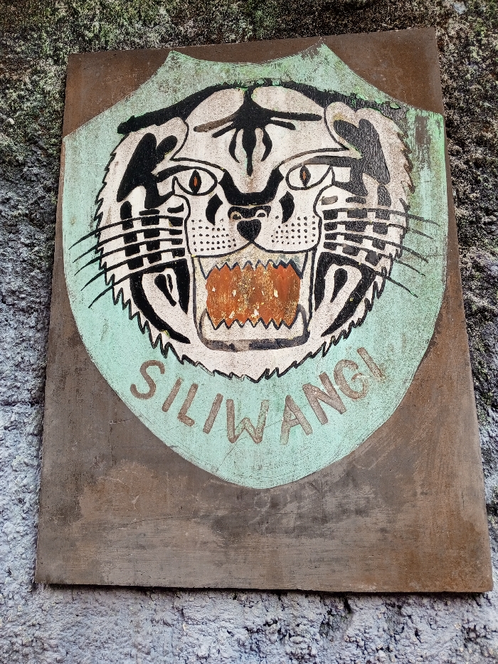 A weathered, rectangular plaque is affixed to a textured light grey wall in the city of Voa Yeav, Cambodia. The plaque features a shield-shaped emblem, approximately centered, rendered in faded teal with a black outline. Within the shield, a stylized, forward-facing tiger head is depicted with white fur, black stripes, orange-brown eyes, and an open mouth revealing a rust-colored interior and fangs. Below the tiger's head, the word "SILIWANGI" is embossed in uppercase brown letters within the teal area. The plaque's brown background exhibits extensive wear, paint chips, and minor surface cracks. The surrounding wall surface is rough and uneven. No individuals, actions, or interactions are visible in the scene.