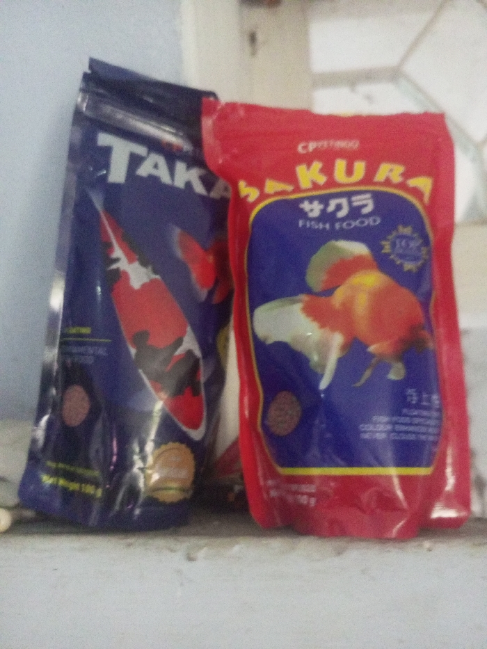 Two sealed pouches of fish food are positioned upright on an off-white, textured surface against a light background in Zee Pin Kone, Myanmar