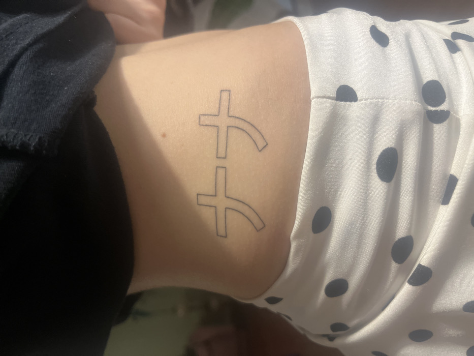 person's arm, featuring a tattoo of two symbols stacked vertically