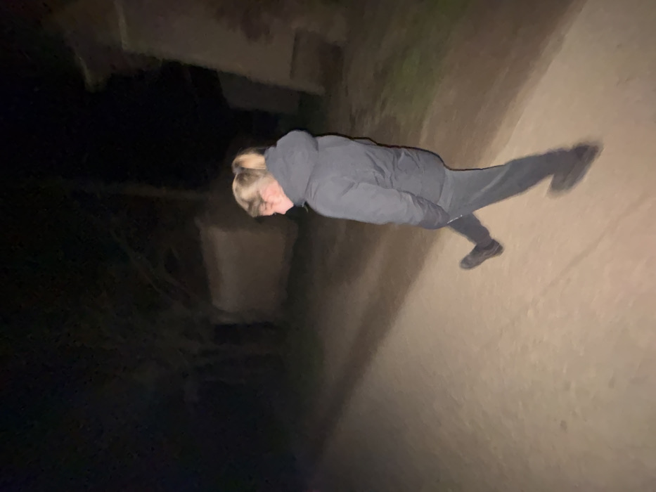 A blonde female is depicted walking from left to right across an unpaved road or path at night in Gromshin, Bulgaria