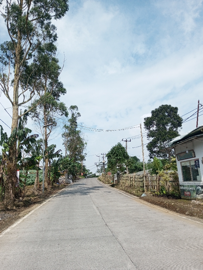 The image depicts a deserted, ascending paved road in Sandamal Eliya, Sri Lanka, under a bright, partially cloudy sky. The road, appearing to be concrete or asphalt, features a faint central longitudinal seam and no visible lane markings. On the left side, a dirt verge borders a row of tall trees with slender trunks and green foliage, behind which dense banana plants and other vegetation are visible. A red and white signpost is partially obscured by foliage near the road's edge. On the right side, in the foreground, a single-story white building with a dark roof and a window is present. A sign on the building displays text including "TANAMANNYA JUARA" and "15.000". Adjacent to the building, a wooden slatted fence runs parallel to the road, bordering green plants. Utility poles with multiple overhead power lines are distributed along both sides of the road, extending into the distance. One pole on the right side features a solar-powered street light. The environment is characterized by lush green vegetation, indicating a rural or semi-rural setting. No people, animals, or vehicles are present in the scene.