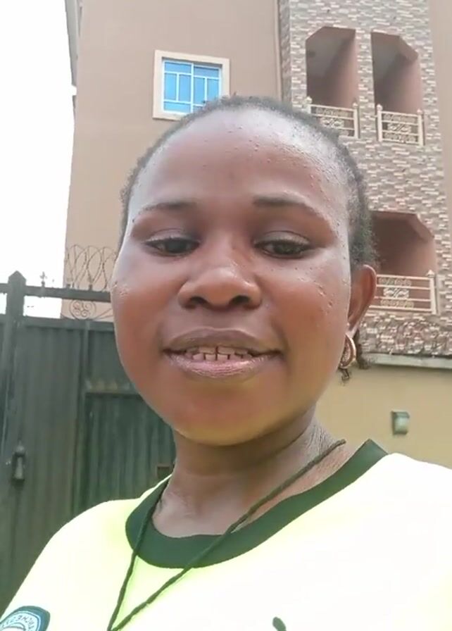 A woman in a light-yellow t-shirt with a black collar and the Puma logo smiles and says “long awaiting day will be here in two days time”. The woman is outside a tall brown building with light-blue windows and gray stonework. A black wrought iron fence is behind the woman. The sky is white.