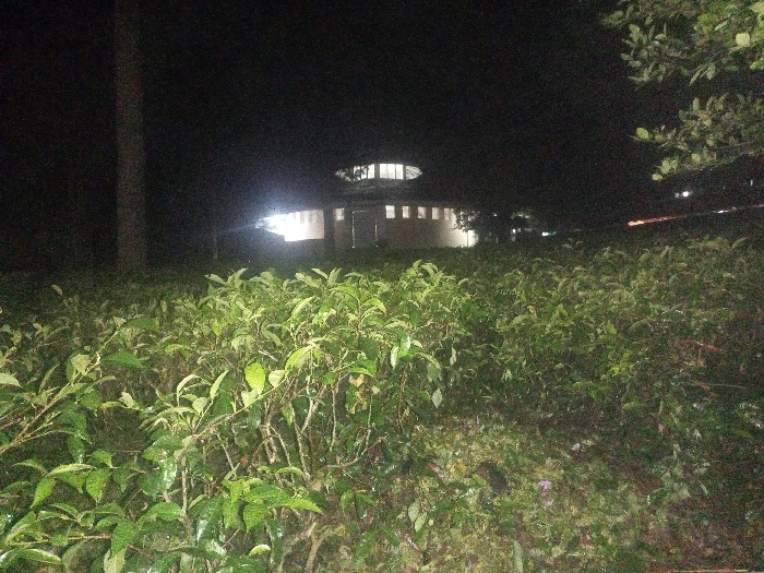 The scene is a nighttime exterior view, located in Ciherang, Indonesia. The foreground is occupied by a dense field of cultivated green plants, consistent with tea bushes, which extend across the lower half of the frame. Individual leaves and branches are discernible, with some exhibiting a reflective sheen. In the mid-ground, a multi-story building is partially visible, brightly illuminated by interior lights. The building features a distinct rounded or domed structure at its apex with visible windows, and a lower facade characterized by multiple horizontal, illuminated windows. A tall, dark, vertical object, likely a tree trunk, is present on the far left. Sparse tree foliage is visible against the dark sky on the upper right. The environment is dark, indicating nighttime conditions. No individuals, animals, or active subjects are present within the frame, and no discernible actions or interactions are occurring.