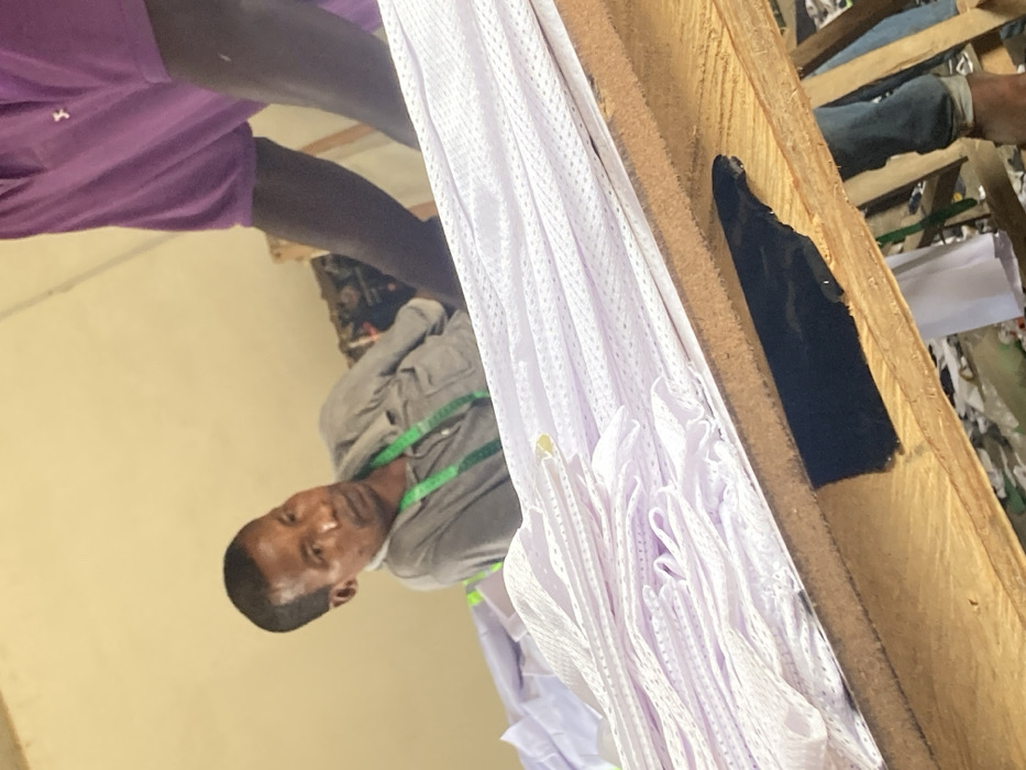 An indoor scene in Agege, Nigeria, depicts a textile workshop environment