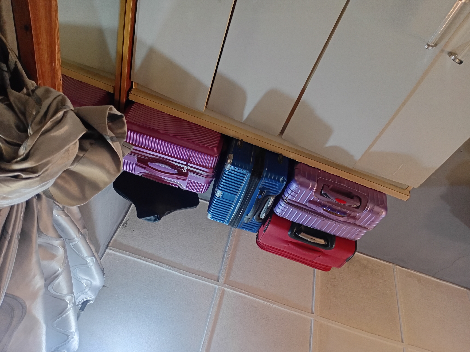 several colorful suitcases stacked under a white cabinet, with a beige curtain visible on the left. The floor is tiled.
