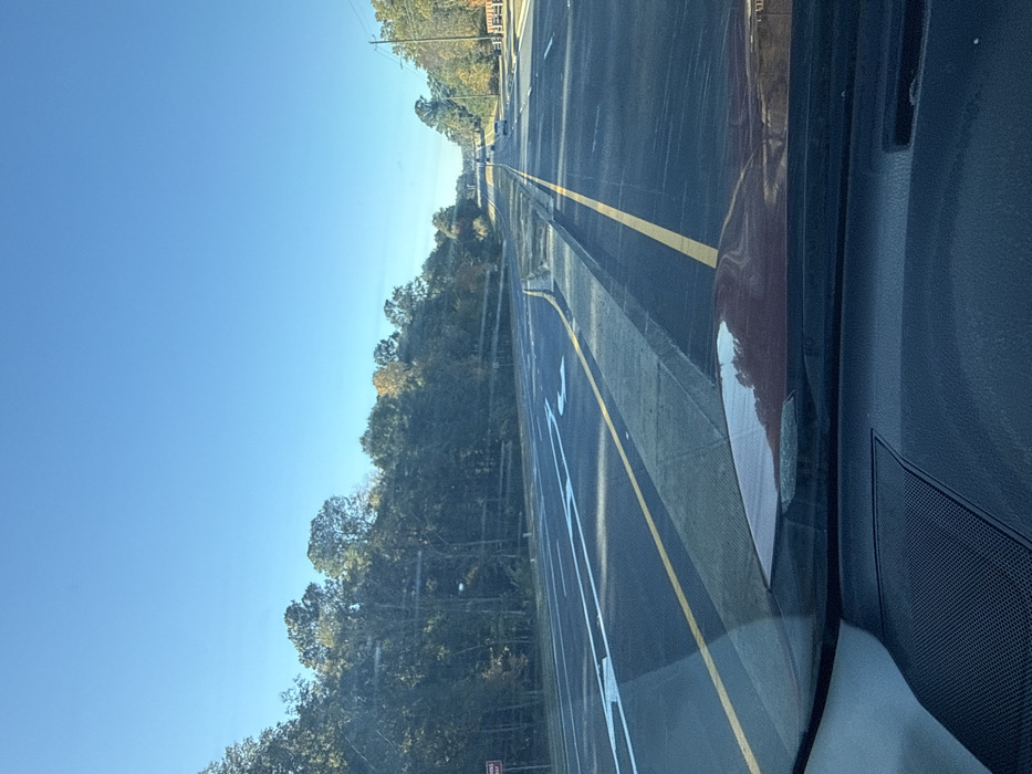 The image displays a multi-lane highway or major road located within Loganville, Georgia, United States. The perspective is from the interior of a vehicle, looking forward through the windshield, with a dark red vehicle hood and dashboard visible in the foreground. The scene is illuminated by a clear, bright blue sky. The asphalt road surface features distinct white lane markings, including straight-ahead and turn arrows painted on the pavement. Double solid yellow lines delineate the separation between opposing directions of traffic, while white dashed lines separate lanes traveling in the same direction. A concrete median or raised divider occupies the center of the road, exhibiting characteristics of recent construction or paving work. Dense tree lines, composed of both deciduous and coniferous species, flank both sides of the roadway. Some deciduous trees display early autumn foliage with visible yellow and orange hues. In the far distance, several vehicles are observed traveling in the same direction as the vantage point, indicating active traffic flow. A partially obscured red informational sign is visible on the left side of the road, positioned near the treeline. Faint utility poles and overhead power lines are discernible along the right side of the road, above a visible guardrail structure. No individuals are directly visible in the scene.