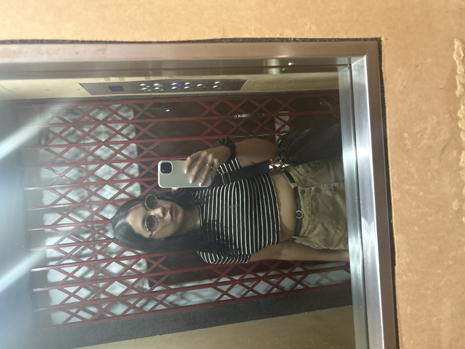 A person with dark hair and round sunglasses takes a mirror selfie in an elevator. They are wearing a striped crop top and tan shorts with a black belt. The elevator has a red lattice-style gate and a control panel with buttons. The mirror is framed with silver trim, and the surrounding walls appear to be beige.