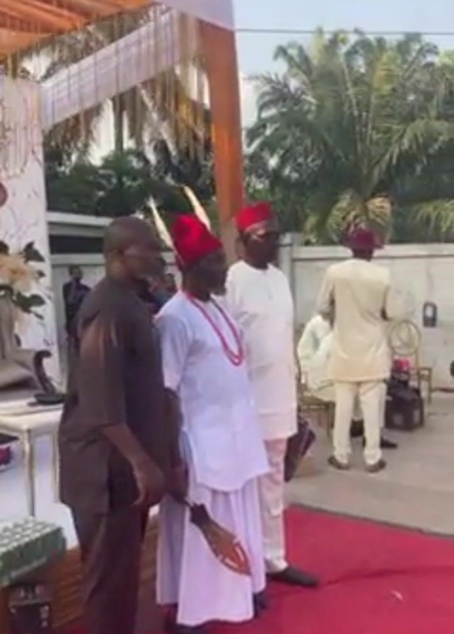 Here is a detailed description of the video: The video appears to capture a traditional or cultural event taking place outdoors. Several men are dressed in traditional clothing. Some wear white outfits, traditional red caps, and red beaded necklaces. One man holds a ceremonial spear. A red carpet runs in front of a white and gold decorated area. There is a stack of Heineken beer visible as well. Later in the video, a man dressed in a light-colored traditional outfit and red cap is seen standing in front of a tent that has a sign that says "NNokwa United Brothers" on it. A person in a black jacket approaches him. Other people wearing red caps are seated in the background. The surrounding environment includes palm trees and other greenery. The video seems to be taken during the day.
