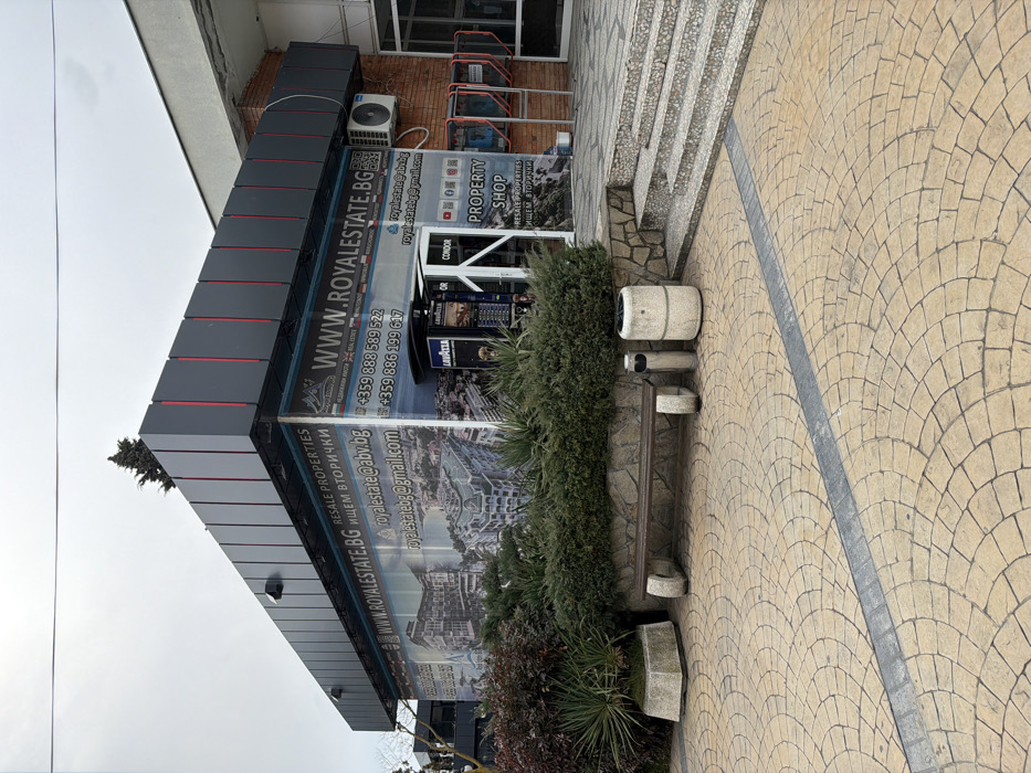 The image displays the exterior of a commercial building in Nesebar, Bulgaria, under an overcast sky