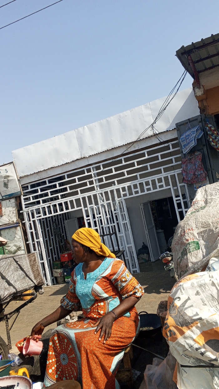 This image depicts an outdoor commercial scene in Tempure, Nigeria, under a clear blue sky