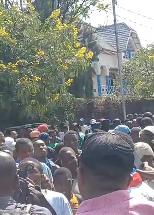 A large group of people, predominantly Black men, are gathered on a street. Some are holding up a sign written in French that mentions "kidnapping" and lists several names. The crowd appears to be densely packed. Trees with yellow flowers line the street. A house with blue accents is visible in the background. Several people are looking towards the direction the camera is facing. Some people are taking pictures or recording videos with their phones. The overall impression is of a protest or demonstration.