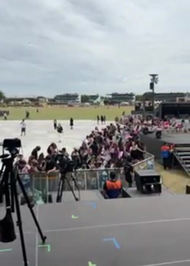 large outdoor concert venue with a stage. The foreground of the video captures an empty part of the stage, including camera equipment and blue and green tape markings on the floor. The middle ground reveals a crowd of people gathered near the stage. Further back, more people are spread out across a grassy area, which could be a field or park. The sky is overcast, with a pale, cloudy look. Overall, the scene suggests a concert or large outdoor event getting ready to start or in progress.