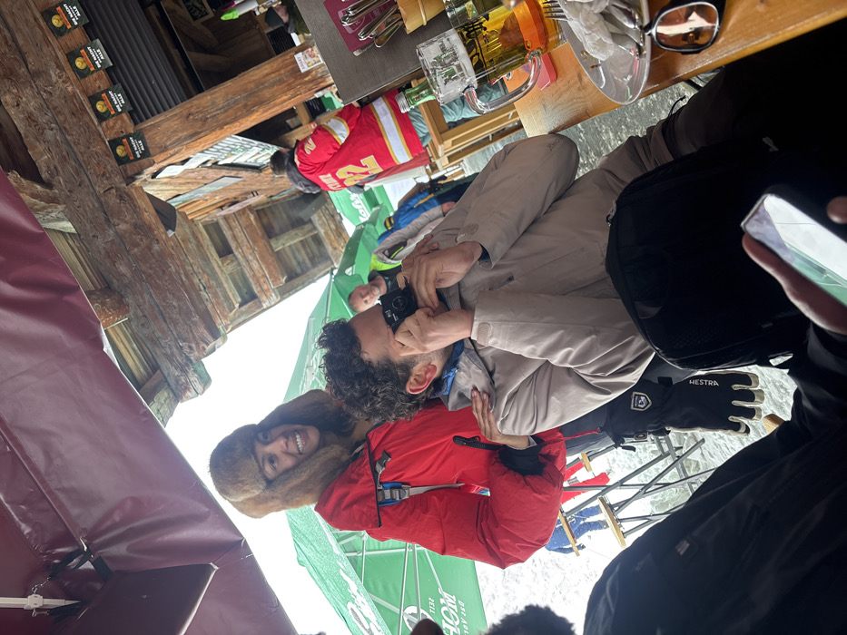 The scene depicts a lively outdoor or semi-outdoor dining area, likely a ski lodge or apres-ski bar, in St
