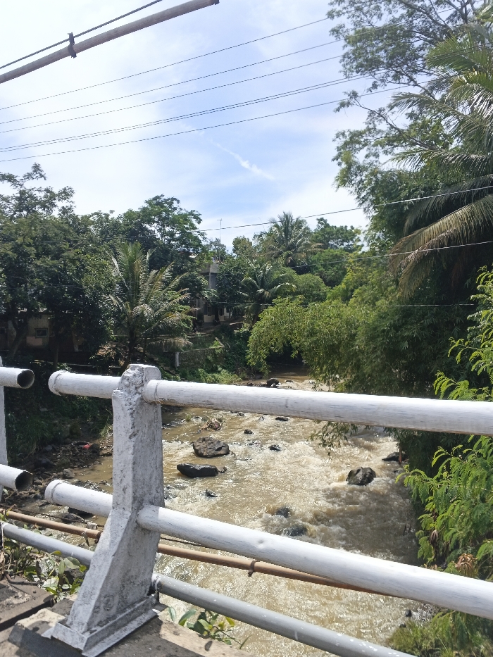 A white concrete and pipe railing overlooks a muddy river with rocks. Lush green trees line the banks of the river with a few buildings visible behind the foliage. Power lines stretch across the top of the image under a blue sky with a faint contrail. The view appears to be from a bridge.