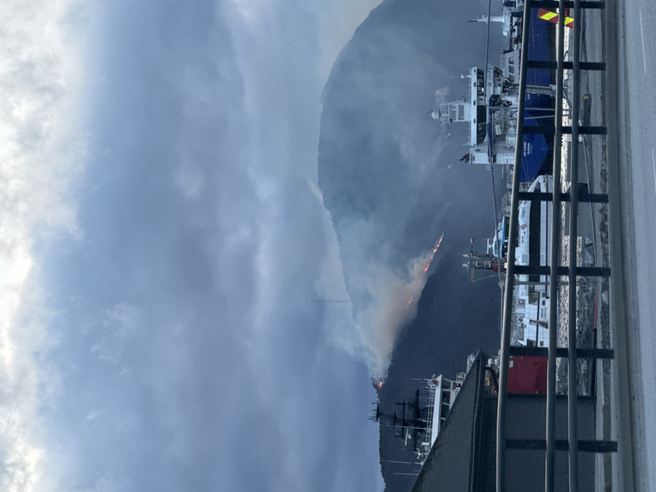 The image depicts a panoramic view of a coastal city, identified as Ålesund, Norway, under an overcast sky. In the background, a large, dark mountain dominates the scene, exhibiting an active wildfire across its middle and upper slopes. Multiple plumes of pale smoke rise from the burning areas, partially obscuring the mountain's features, including a tall, slender mast or antenna structure near its peak. The fire appears as distinct orange-red flames spread horizontally across the dark green/brown vegetation of the mountainside. In the midground, a body of water, consistent with a harbor or fjord, stretches across the frame. Several vessels are visible within this water. On the left, a large multi-deck ship with a white superstructure and dark hull is partially visible behind a dark-roofed building. Towards the center, a white passenger vessel or fast ferry, labeled "HAVILA," is moored. To the right, a larger blue and white vessel, identified by the name "ELBJØRN" on its hull, is also docked. The foreground features a dark metal railing, likely part of a bridge or promenade, running horizontally across the bottom section of the image, partially obscuring the water and vessels. A small section of a dark-roofed building is visible on the far left, beyond the railing. A yellow reflective sign with black stripes is partially visible on the right side of the foreground, behind the railing. No individuals are discernible in the frame. The overall impression is one of a marine environment with an ongoing wildfire incident on the adjacent landmass.