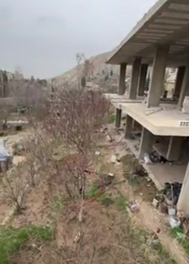 n unfinished concrete structure standing in a rural area. The building is two stories tall and appears to be a residence under construction. The unfinished state reveals the concrete beams and pillars that support the floors and roof. The surrounding environment is characterized by sparse vegetation, including trees without leaves, possibly indicating a winter or early spring setting. A hill or small mountain is visible in the background. Debris and construction materials are scattered around the base of the building. The sky overhead is overcast.