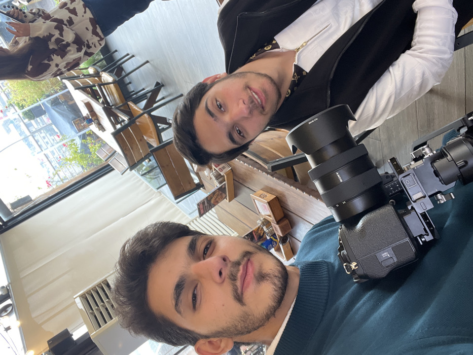 The image depicts an indoor scene within a cafe or restaurant located in Kafr Sousa Municipality, Syria. Two young males are in the foreground, taking a selfie. The male on the left, with dark hair and a beard, wears a dark teal turtleneck sweater and holds a Sony mirrorless camera mounted on a black camera rig with a large lens. He looks directly into the camera. The male on the right, also with dark hair and a beard, wears a white long-sleeved shirt with a zippered collar and a dark open vest; he is smiling faintly and looking towards the camera. In the background, partially visible, a third person, wearing a brown and white cow-print sweater, holds a smartphone and appears to be looking away from the camera, towards large glass windows. The environment includes wooden tables with matching wooden chairs. Some tables have condiment holders, menus, and small wooden boxes. Beyond the glass windows, an outdoor area with potted plants featuring red flowers, railings, and distant urban buildings is visible. Inside, a white air conditioning unit is mounted high on the left wall, and white vertical blinds or curtains are present. The floor is tiled with grey squares.