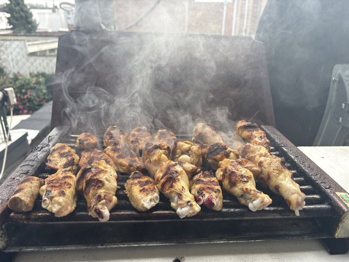 The image depicts an active grilling scene on an outdoor patio or balcony, consistent with a residential area in Antwerp, Belgium, though a precise location within the city is not discernible. The primary subject is a rectangular, dark-colored barbecue grill filled with approximately two dozen pieces of chicken, predominantly drumettes or small wings, and one sausage-like item on the far left. The chicken pieces exhibit varying degrees of doneness, with some displaying prominent grill marks and charring, while others retain a paler skin tone. Significant plumes of white smoke are actively rising from the grill surface, indicating ongoing cooking. The grill itself appears to be an older model with a high back, possibly an open lid. In the immediate background to the left, green foliage with scattered pink blossoms is visible, along with light-colored architectural elements and a distant rooftop. The background to the right shows a dark, indistinct object or covering, behind which faint brick-colored building structures are discernible under natural daylight. No individuals are visible in the frame.