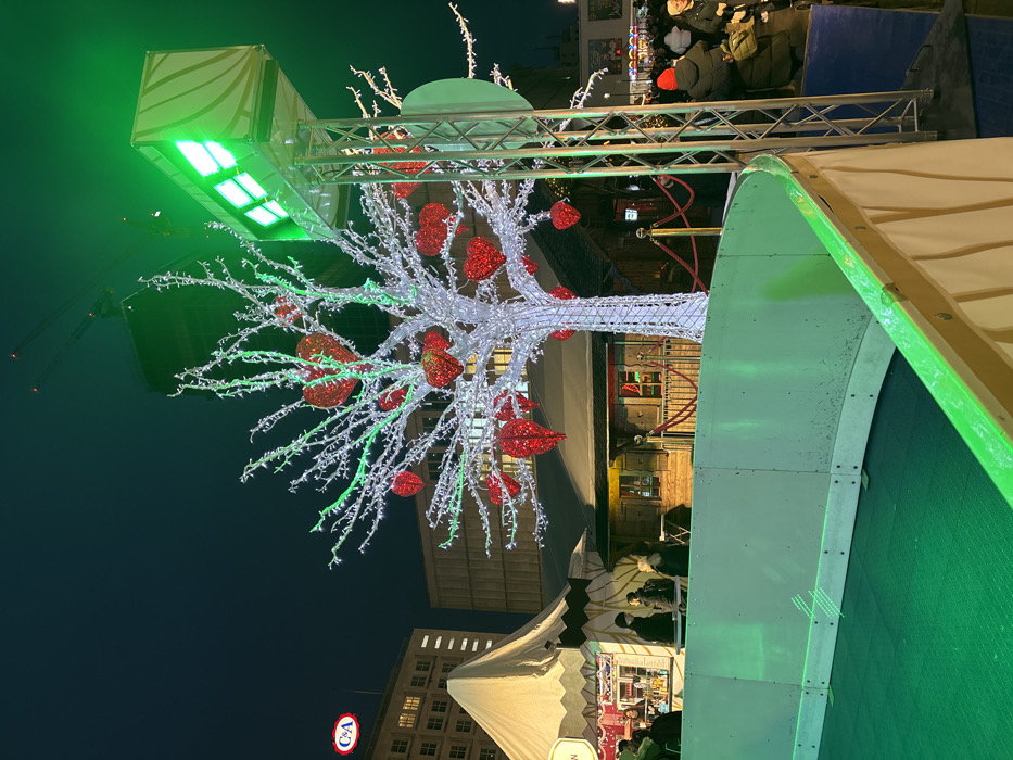 This image captures a nighttime scene at the Christmas market located at Alexanderplatz in Berlin, Germany. In the immediate foreground, a curved white barrier delineates the edge of an ice rink, whose surface is illuminated by a strong green light. Centrally positioned in the mid-ground is a prominent artificial tree, densely covered in white LED string lights and adorned with numerous large, reflective red heart-shaped ornaments. To the right of this tree, a metal truss structure supports a rectangular light fixture that emits a vivid green light. To the left, a cream-colored, peaked tent-style market stall is visible, with several individuals gathered around a counter beneath it. Behind this tent, a dark wooden market stall building is partially visible. In the background on the left, a multi-story building features multiple illuminated windows and a prominent red and white "C&A" logo on its upper facade. Further into the background on the right, a crowd of people is visible, with one individual distinctly wearing a red beanie. Above the background structures, the silhouettes of construction cranes are discernible against the dark night sky.