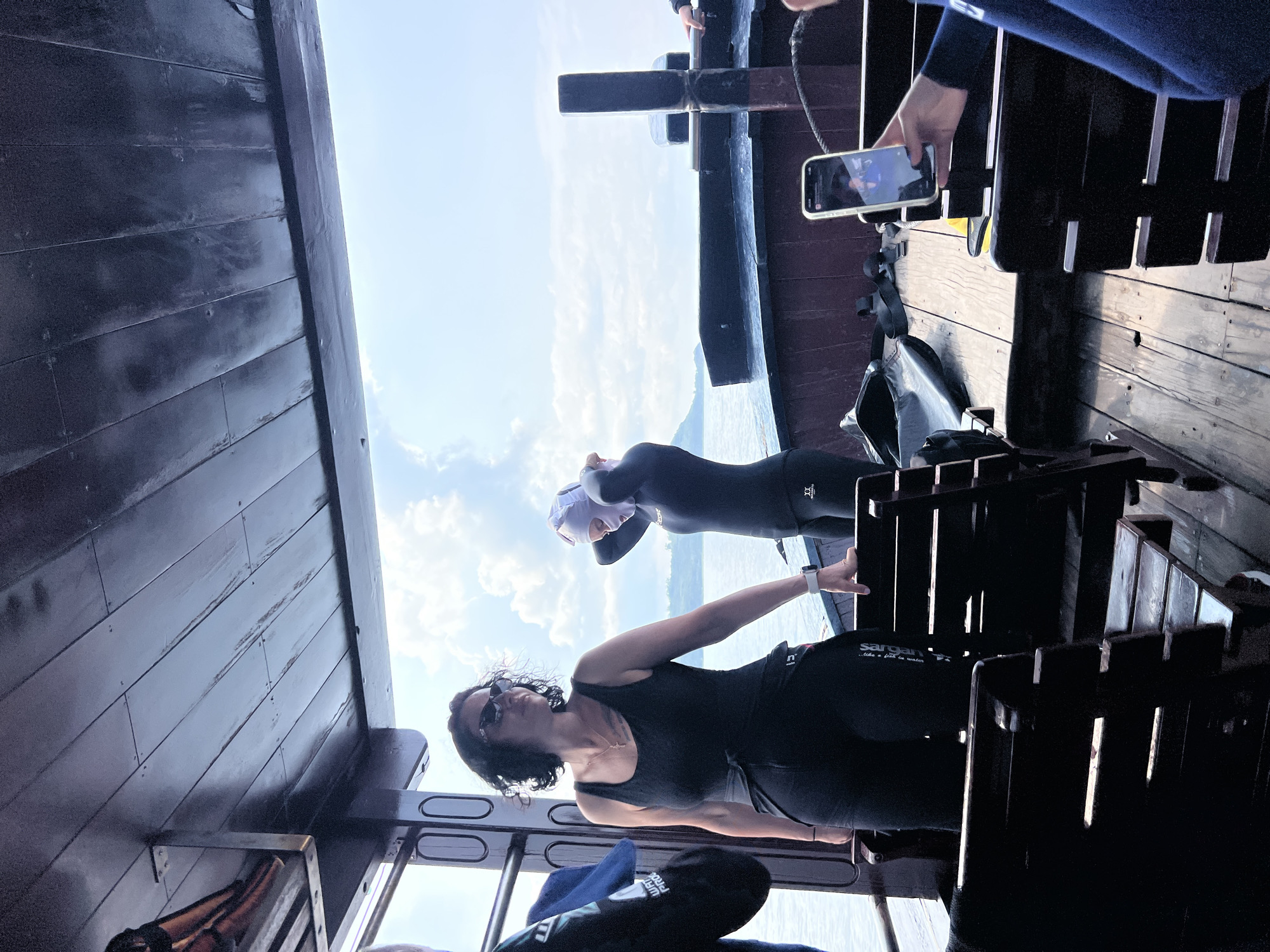 On a boat in the Natural Heritage Area Trang, Vietnam, two women are preparing for a swim or dive