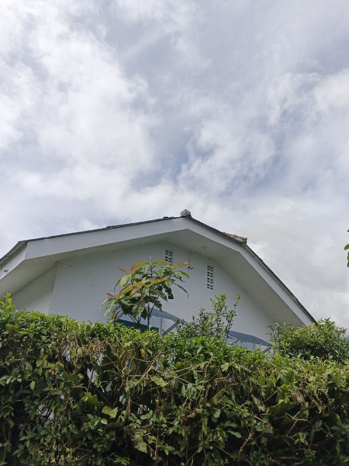 A white building with a gabled roof is partially obscured by a dense green hedge. Small rectangular vents are visible on the building's side. The sky above is filled with scattered white clouds. A small tree with red-tinged leaves grows in front of the building, adding to the verdant foliage.