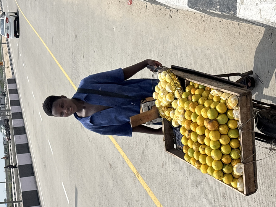 - "A young male, possibly a teenager, stands on the sandy shoulder of a multi-lane asphalt road in Alaguntan, Nigeria, pushing a wooden two-wheeled cart laden with fruit" by FM-ZL5X22, licensed under CC BY 4.0
