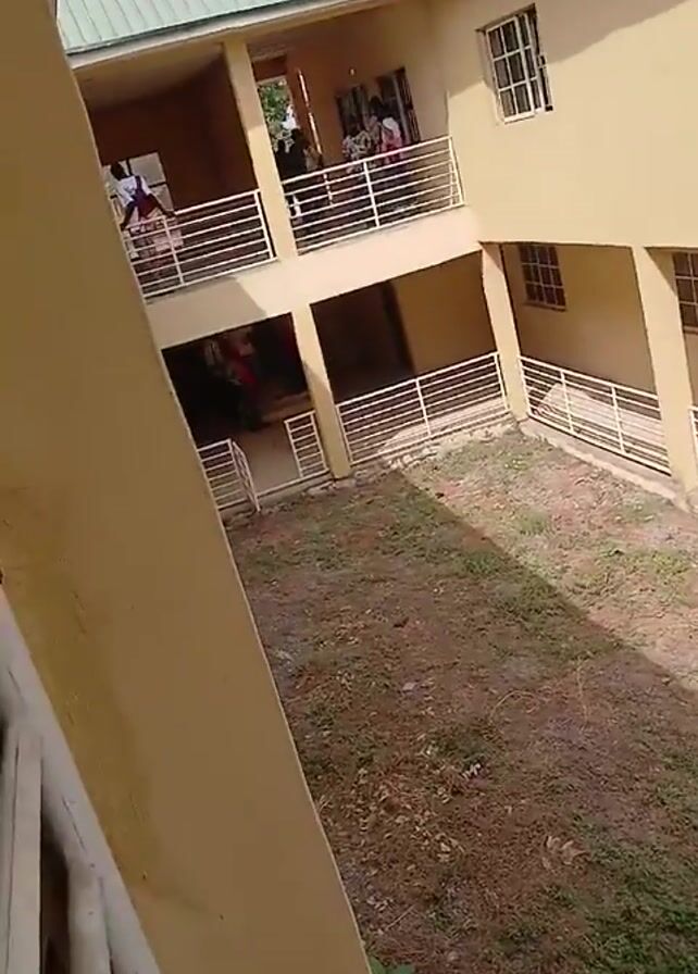 The camera is angled upward towards a two-story building with a courtyard. The building is beige with white trim around the windows, doors, and balcony railings. The courtyard is mostly dirt with patches of grass. People can be seen walking and standing on the balconies of the building, some are wearing casual clothing, others are wearing school uniforms. One person is standing in the foreground looking towards the crowd.