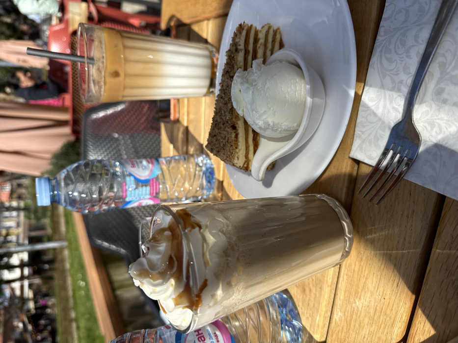The image displays an outdoor cafe table in Kazanlak, Bulgaria, under bright sunlight, casting prominent shadows. The primary subjects are a collection of beverages and desserts arranged on a light-colored wooden slatted table. On the left, a tall glass contains a light brown beverage, possibly a frappe, generously topped with whipped cream and drizzled with caramel sauce. To its right stands a clear plastic bottle of Devin brand mineral water with a blue cap and a light blue label. Further right, another tall glass holds a layered iced coffee, exhibiting distinct strata of light brown coffee over white milk, with a dark straw inserted. In the center, a white oval plate presents a slice of multi-layered cake, topped with a crumbly, granular texture suggestive of crushed nuts. Adjacent to the cake, a scoop of white ice cream rests within a small, white, spoon-shaped ceramic serving dish. At the bottom right, a silver four-pronged fork is positioned diagonally on a white paper napkin featuring a subtle, embossed floral or scroll pattern. The background, largely out of focus, reveals an outdoor cafe setting with dark-colored chairs and reddish-orange market umbrellas or canopies. Distant green foliage and blurred human figures, presumably other patrons, are visible, indicating an active public space.