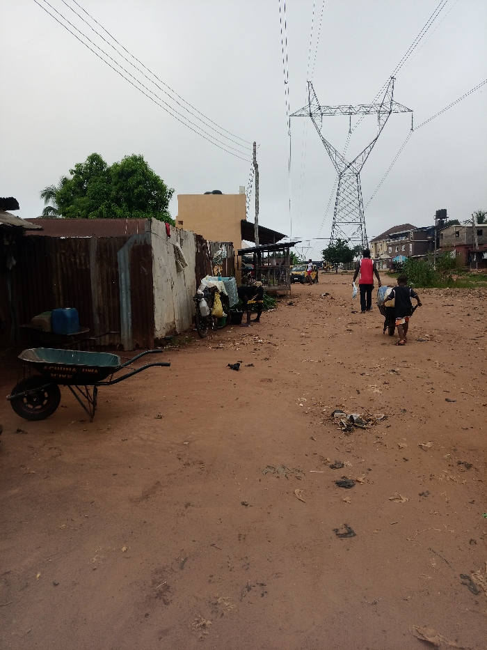 A wide, dusty street with a large electrical tower in the background under an overcast sky. A rusted corrugated metal structure and a tan building flank the left side of the road. A boy pushes a wheelbarrow while a man walks ahead, and another wheelbarrow sits idle on the left. Scattered trash and debris litter the ground. The scene depicts a low-income residential area with basic infrastructure.