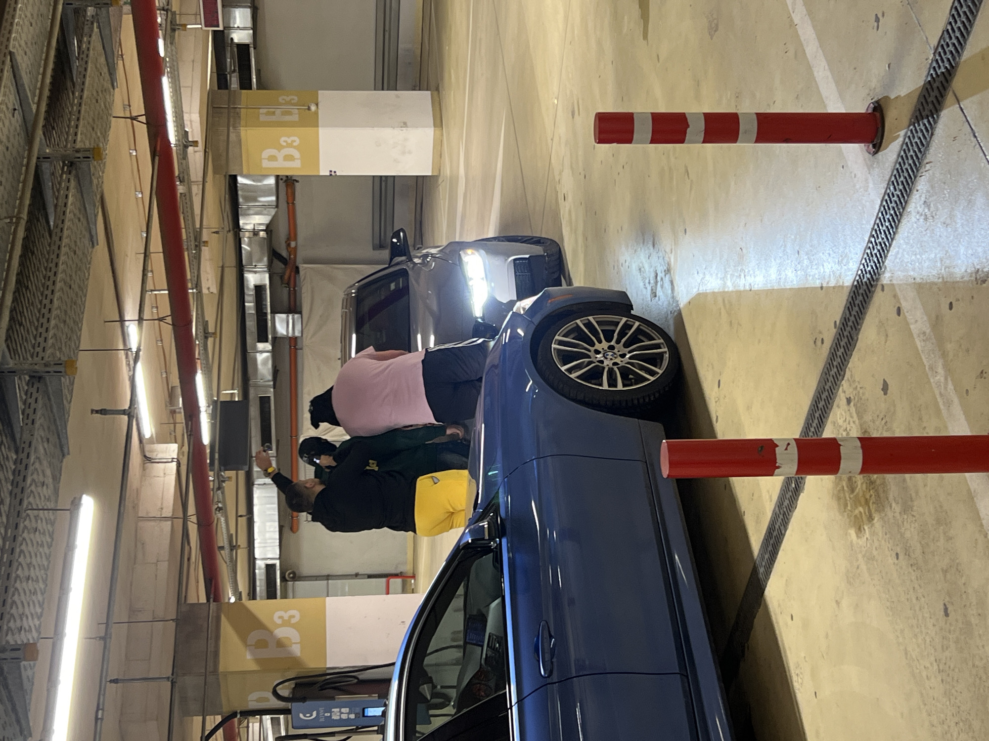 n indoor parking garage, likely in the city of Sofia, Bulgaria, based on potential architectural and environmental factors. The parking area is designated by zones, evidenced by a "B3" identifier on the walls and/or pillars. A blue car occupies a parking space. Adjacent to the car are three individuals. One is wearing a pink top, another in a green jacket, and a third in black, who appears to be taking a picture of the vehicles. The scene includes parking control poles with red and white horizontal stripes, and an electric vehicle charging station in the lower-left corner, further suggesting a modern parking facility.