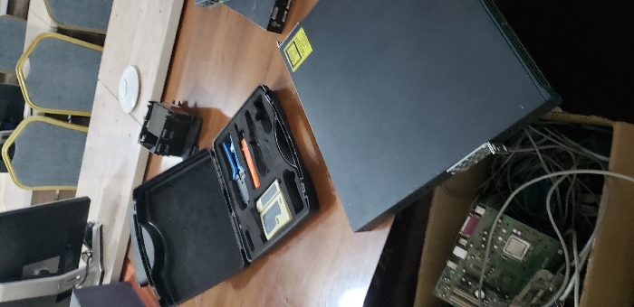 The scene is located in a room within Kandahar, Afghanistan. The specific address or landmark within the city is not visually identifiable. The image displays an indoor setting, likely a classroom, training room, or office. In the foreground, a brown cardboard box contains a green computer motherboard with visible circuitry and a central processing unit (CPU) socket, entangled with numerous white and dark cables. Towards the mid-ground on the right, a black, flat, rectangular electronic device, possibly a network switch or server, rests on a surface, bearing a yellow "LASER PRODUCT" warning sticker on its top panel. Adjacent to it, centrally positioned, is an open black plastic carrying case with custom foam inserts. Inside the case, a blue-handled tool (likely a crimping tool), an orange-handled tool (possibly a cable stripper), and a beige rectangular electronic device (potentially a network tester or power meter) are visible. To the left of the open case, a smaller, dark electronic module is present. Further back on the left, a black computer monitor is positioned on a table. The background features a light-colored wooden table extending horizontally. On this table, a small white circular disk, possibly a wireless access point, is placed. Behind the table, several chairs with gray upholstered backs and seats, accented with gold-colored metal frames, are arranged. No individuals are present in the scene. The lighting appears uniform and functional.