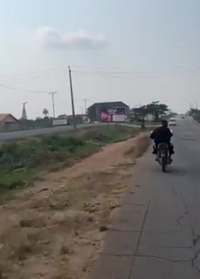 man riding a motorcycle on a paved road. The road has cracks and imperfections. To the left of the road, there is an unpaved shoulder with sparse vegetation. Across the road, a large billboard is visible, advertising "OVAVA". Cars pass on the main road. Overhead, power lines stretch across the sky. The sky is a pale blue with scattered clouds. The overall environment appears to be a suburban or semi-rural area.