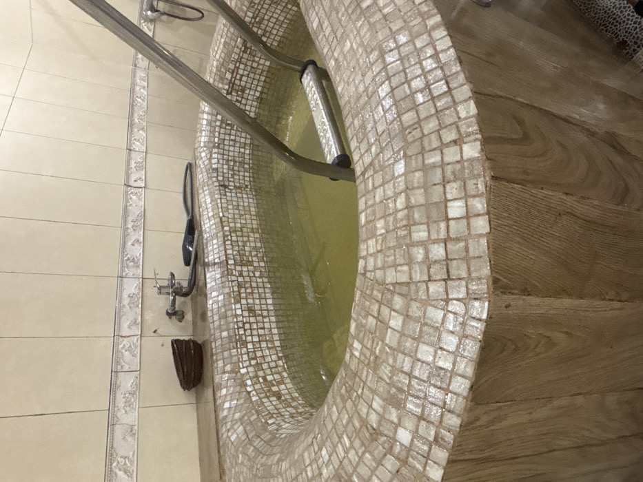 The image displays an indoor bathing facility featuring a large, oval-shaped plunge pool filled with yellowish-green water. The pool's exterior base is constructed from light-colored wooden panels, while its rim and interior are surfaced with small, light-toned mosaic tiles. A two-step stainless steel ladder is partially submerged on the right side of the pool, providing access. The wall directly behind the pool is clad in light beige square tiles, with a decorative textured border running horizontally across its middle section. On the tiled ledge above the pool, to the left, a stack of three small, dark brown bowls is present. Above these bowls, a wall-mounted faucet with chrome-finish is installed. To the right of the faucet, a black handheld showerhead with a flexible hose rests on the ledge. Another chrome-finished shower fixture with a hanging hose is mounted further right on the wall. No individuals, actions, or interactions are depicted. The specific location within Kharkiv, Ukraine, cannot be determined from the visual information provided.