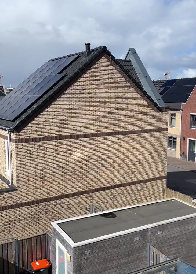 n elevated view over a residential neighborhood on a partly sunny day. The camera pans rightward, revealing the rooftops of various brick houses, many equipped with solar panels. Flat-roofed structures with wooden siding are also visible. Cars are parked in a small parking lot further away. In the distance, larger buildings are discernible, possibly including a sports complex. The sky is blue with scattered white clouds. The video appears to be taken from a higher floor of a building or possibly a drone.