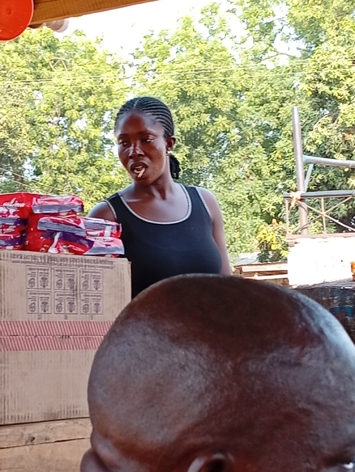 The image depicts an outdoor market scene in Gboko, Nigeria. An adult female, dark-skinned with tightly braided hair, is positioned in the center-left. She wears a black tank top with white trim and small silver hoop earrings. A white stick-like object, possibly a toothpick or candy stick, is visible in her mouth, and she looks towards the right. To her immediate left, several red and white packaged items are stacked on top of a brown cardboard box, which features red striped tape and grid patterns of symbols. This box rests on a rough wooden surface. In the lower right foreground, the back and top of a closely shaven, dark-skinned human head are prominently visible. The background consists of dense green tree foliage. A brown wooden beam spans the top of the frame, and a metallic structural element is partially visible on the far right. A reddish-orange object is present in the upper-left corner.