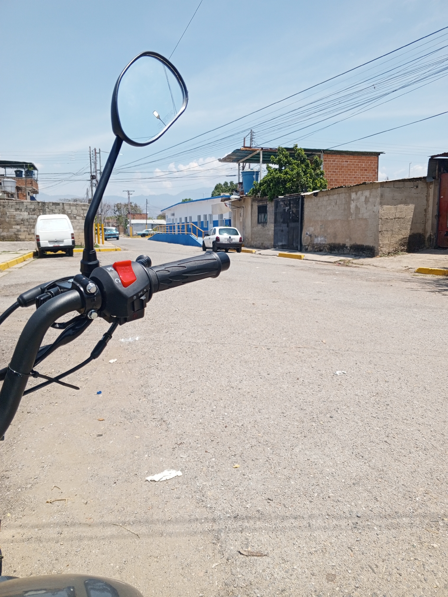 The image depicts a daytime scene from the perspective of a motorcycle rider on an asphalt road in Santa Rita, Venezuela. In the immediate foreground, the right handlebar of a motorcycle is visible, featuring a black grip, a red kill switch, and other control elements. The right rearview mirror, black-framed and oval, reflects a segment of the blue sky and a distant streetlamp. The road ahead is a two-lane asphalt surface, appearing largely empty. Yellow curb markings delineate the edges of the road on both sides. Scattered debris, including white plastic and small dark objects, is visible on the asphalt surface. On the left side of the road, a white panel van is parked against a low concrete block wall. Beyond this wall, structures with a blue water tank, brick sections, and sparse green foliage are discernible. Overhead, a dense network of utility wires stretches across the frame. On the right side, further down the road, a light-colored sedan is parked near a building with a white facade accented by prominent blue trim around windows and a doorway, possibly a public or institutional building. Adjacent to this building are unpainted concrete walls and a structure with exposed brickwork. In the background, a clear, light blue sky dominates above distant mountains. The overall lighting suggests a bright, sunny day with strong sunlight. No individuals are present in the visible scene.