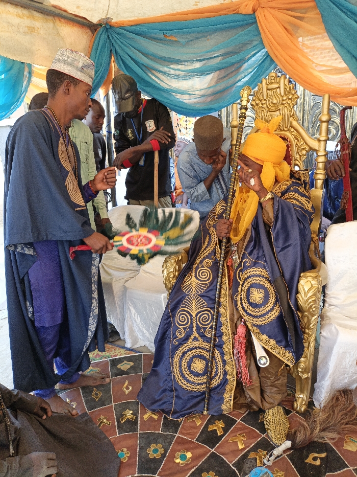 A ceremonial gathering is depicted under a draped tent in Gwagwarwa, Nigeria