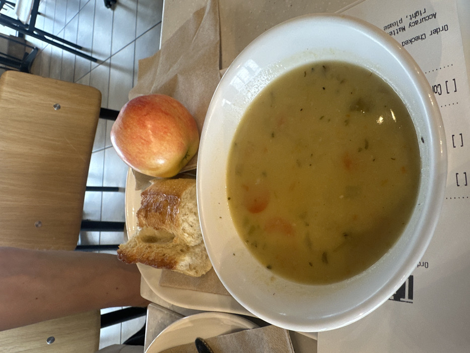 The image displays a meal served on a white tabletop within an indoor dining establishment in Medford, United States. In the immediate foreground, a white ceramic bowl contains a creamy, light yellow-green soup with visible orange (likely carrots) and green vegetable pieces. To the left of the soup, a white rectangular plate holds a torn piece of light brown, crusty bread. Adjacent to the bread on the same plate, and resting on a light brown paper napkin, is a red and yellow apple. A white paper placemat with black text is partially visible beneath the soup bowl. The background is blurred, showing parts of wooden chairs with metal frames and a light-skinned person's bare leg on the far left. The floor appears to be light-colored tile.