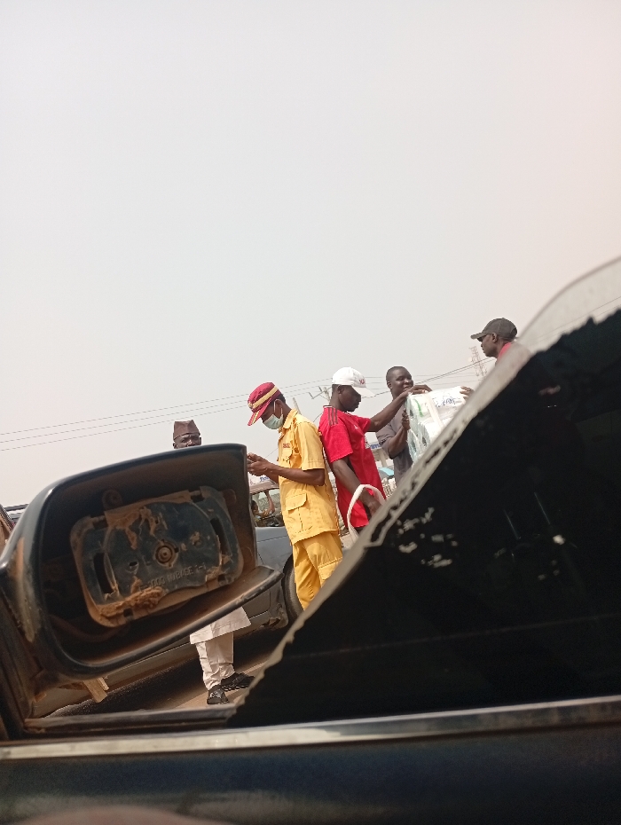 The scene depicts an outdoor urban environment in Suleja, Nigeria, under a hazy or overcast sky, suggesting diffused daylight. In the immediate foreground, a dark-colored vehicle's side-view mirror is visible on the left, severely damaged with its reflective glass missing, exposing the internal mechanism and accumulated dirt. To the lower right, a fractured section of the same vehicle's dark bodywork is present. In the midground, five male individuals are observed. From left to right: 1. A person in a light-colored traditional outfit and a brown cap, partially obscured by the mirror, standing and observing the scene. 2. A man in a yellow uniform consisting of a long-sleeved shirt, trousers, and a cap with a red brim. He wears a light blue surgical mask and is looking downwards, engaged with an unseen object in his hands. 3. A man in a red t-shirt and a white baseball cap, holding a white plastic bag and looking towards the individual immediately to his right. 4. A man in a dark t-shirt, smiling, holding a white rectangular package or item with both hands, seemingly presenting it or engaging in an exchange with the person to his left. 5. A partially visible man in a dark cap and shirt, positioned to the right of the smiling man. In the background, additional vehicles are discernible, indicating a street or roadway. Faint overhead power lines are visible against the sky, and blurred structures or buildings suggest a developed urban setting. The damaged vehicle components in the foreground imply a potential incident or state of disrepair.