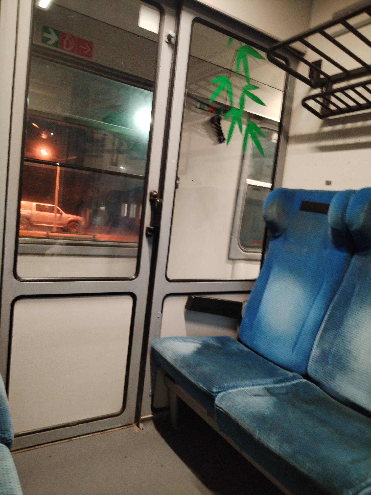 A view from inside a train in Stamboliyski, Bulgaria. A door to the left shows a white pickup truck parked outside, lit by a streetlamp. Exit signage is visible above the door. To the right are two blue seats with a metal luggage rack above. Green bamboo-like decorations are on the window.