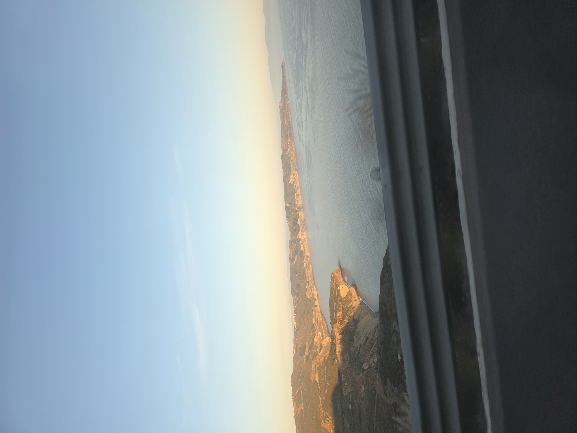 A view of a coastline, likely taken from inside a vehicle or building due to the presence of window frames in the right part of the image