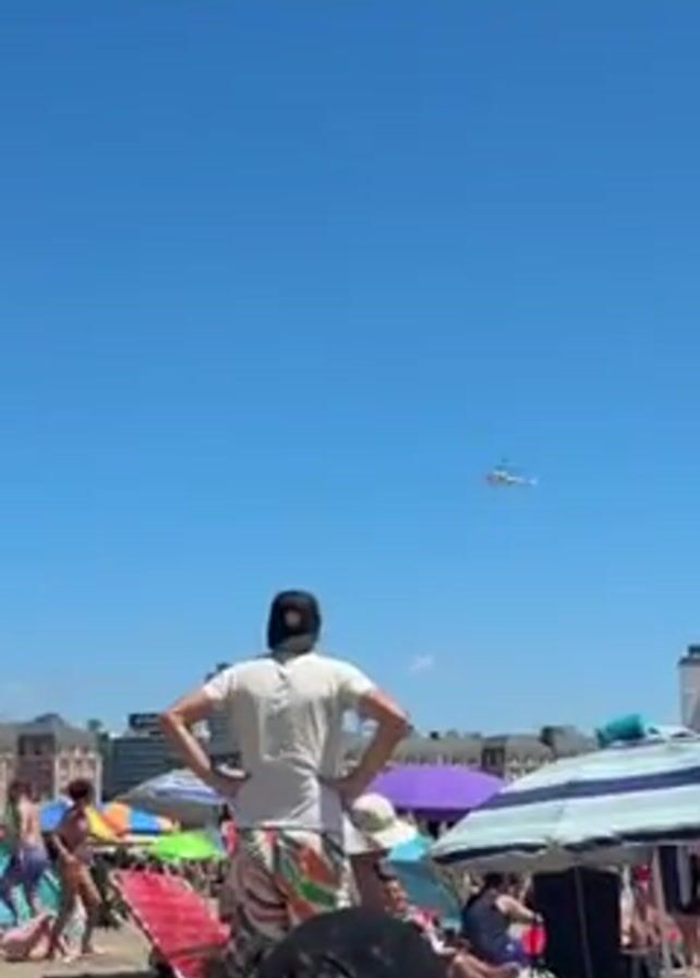 The video depicts a beach scene on a sunny day with a clear blue sky. Numerous people are visible relaxing under colorful umbrellas. In the foreground, a person wearing a white t-shirt and a black baseball cap stands with their hands on their hips, looking upwards. A light blue and white helicopter is flying in the sky above the beach. The camera zooms in on the helicopter as it approaches. Buildings are visible in the background skyline. A person is seen sitting in the foreground, while another individual appears partially in the frame on the right side.