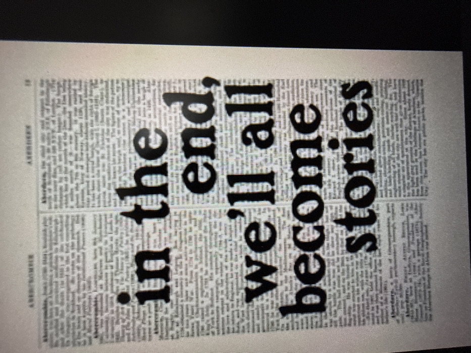 This image is a photograph of a digital screen displaying a printed page, captured in Stara Zagora, Bulgaria. The page appears to be from a reference work, featuring two columns of dense, small-font black text on a light background. Visible headings in the smaller text include "ABERDEEN" and "ABERDEENSHIRE." Superimposed centrally over this background text, in a significantly larger and bolder black font, is the quote: "in the end, we'll all become stories." No individuals are present in the image. The scene exclusively depicts the text on the digital display, with slight pixelation visible, suggesting it is a screen capture or photograph of a screen.