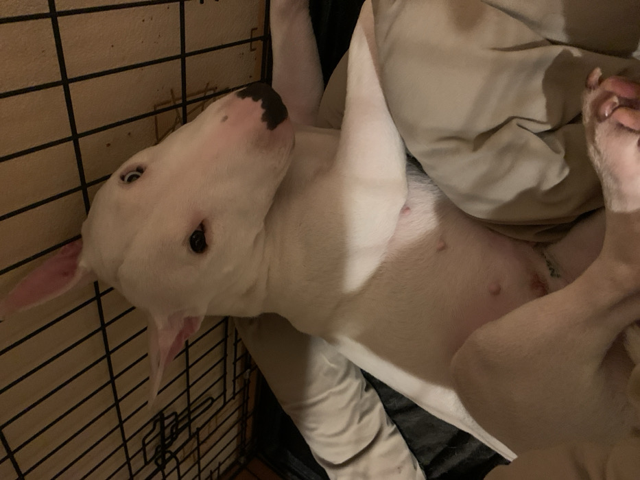 A white Bull Terrier lies on its back in a cage